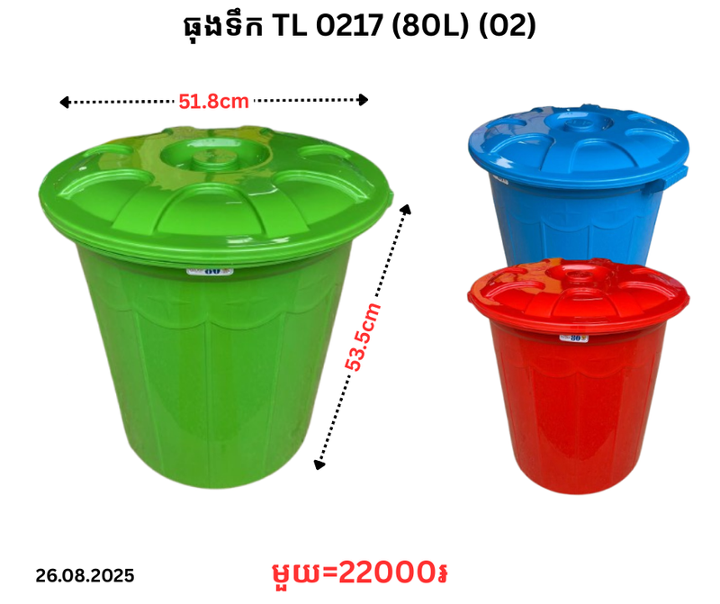 ធុងទឹក TL 0217 (80L) (02) December 24, 2025 Posted in 22000, TL, ធុងទឹក, ធុងទឹក TL Product Code : 0217