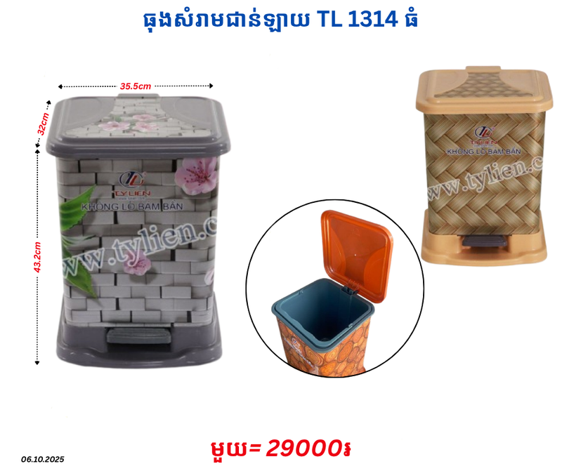ធុងសំរាមជាន់ឡាយ TL 1314 ធំ December 23, 2025 Posted in 29000, TL, ធុងសំរាម, ធុងសំរាមជាន់, ធុងសំរាមជាន់ឡាយ, ធុងសំរាមជាន់ឡាយ TL Barcode : 8936082380612